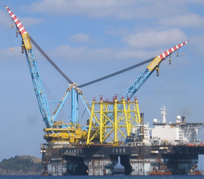 SAIPEM 7000 ligger durende nede i havnen ved brakken der jeg bor. Det er det nest største kran fartøyet som noensinne er laget. Bygget i 1985 og sjøsatt året etter. Hun er litt av ei dame med sine 175 m høyde og 90 meter bredde. Og hun løfter 14.000 tonn om hun må. Opprinnelig var hun en halvt nedsenkbar kran, (Mikoperi 7000) men ble bygget om i 1999 for å kunne legge rørledninger på store havdyp.